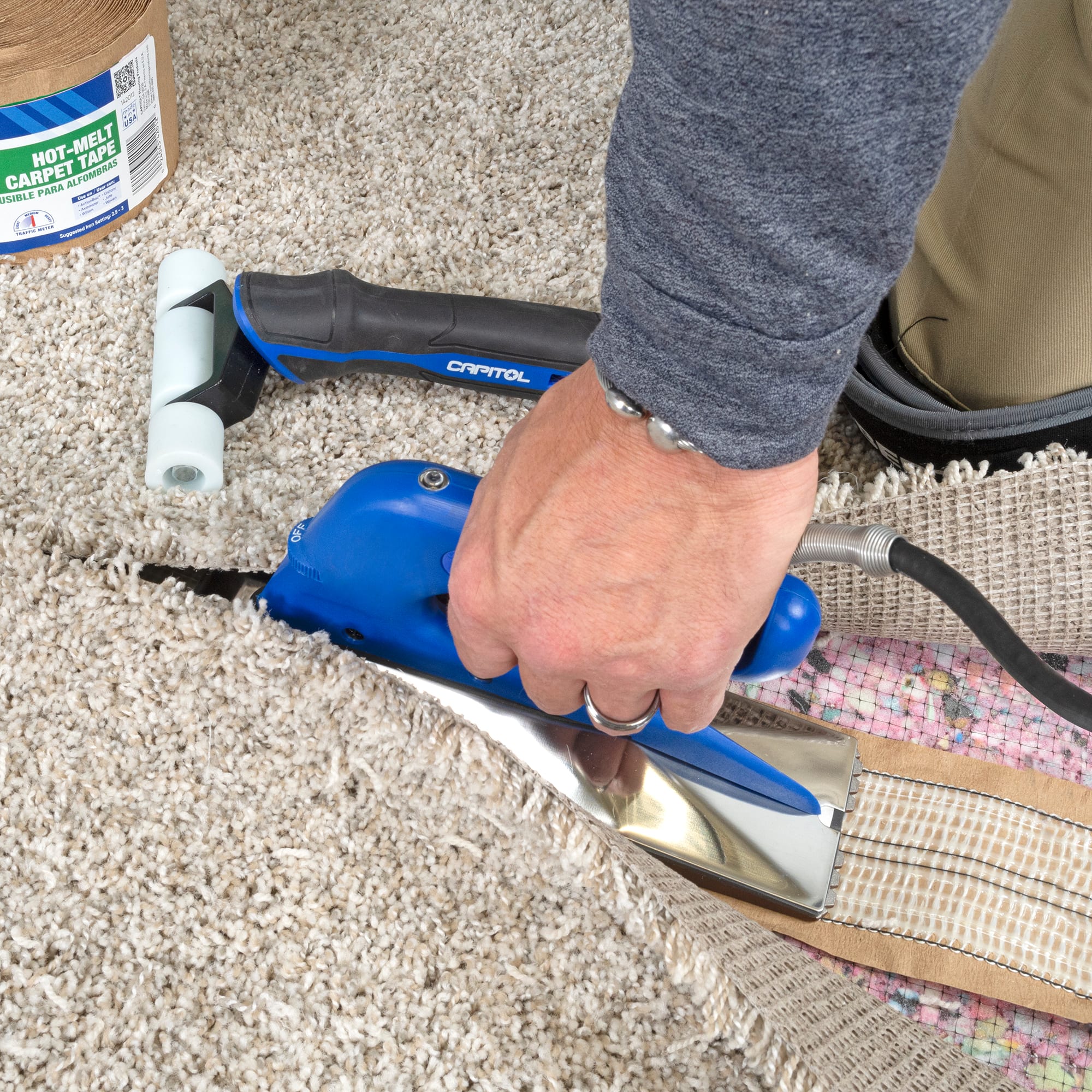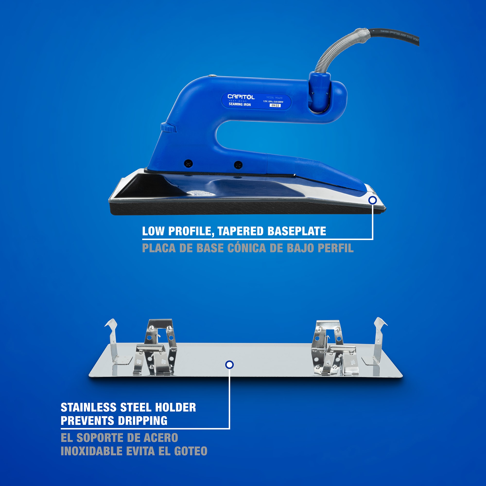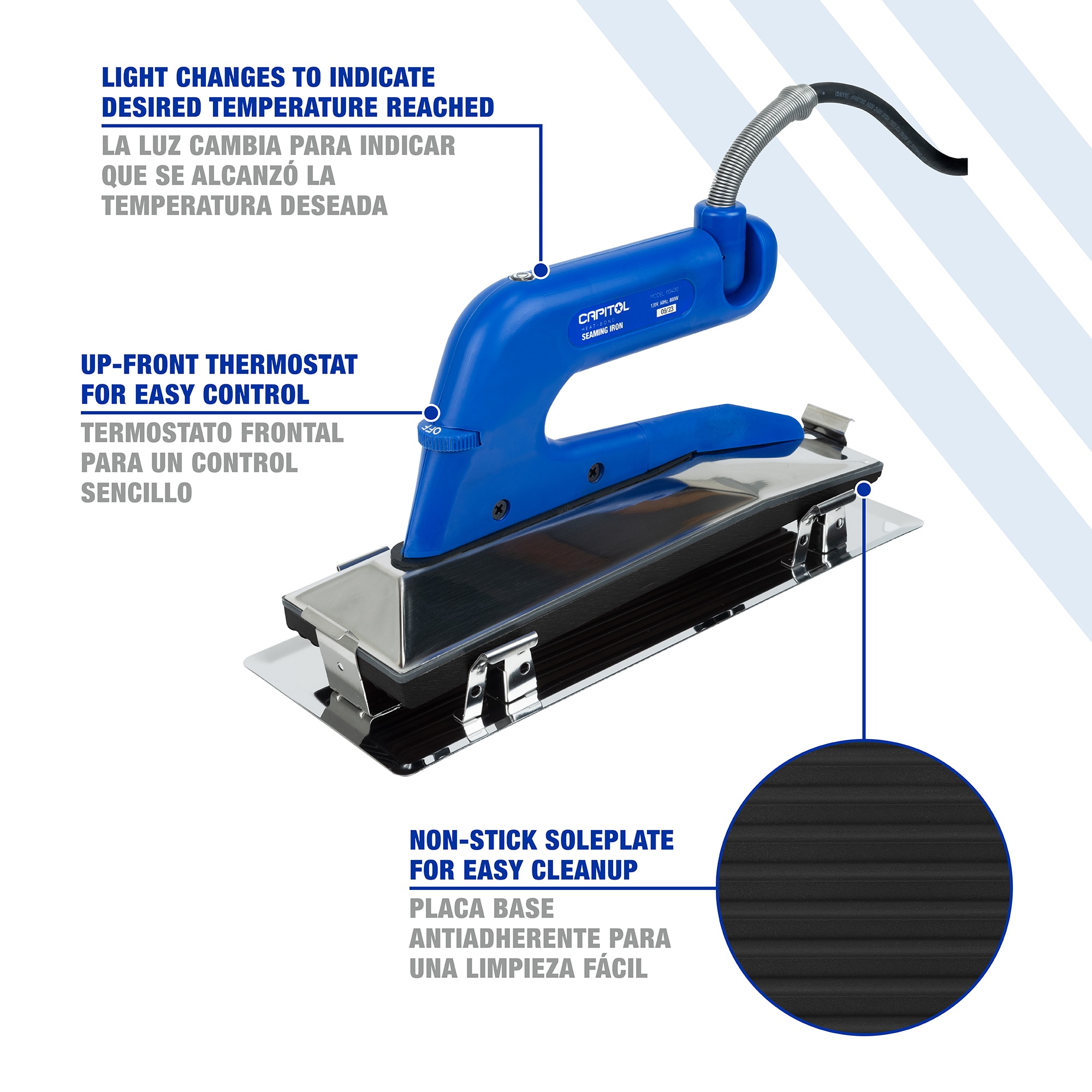 La plancha para uniones termoadhesivas de bajo perfil y optimizada de Capitol® proporciona una distribución uniforme del calor para un derretido completo y facilita la unión de costuras de las alfombras. El termostato ajustable y la protección contra el calor proporcionan un calentamiento ideal para adherir cintas termoadhesivas para alfombras, y a la vez protege la alfombra de temperaturas altas.