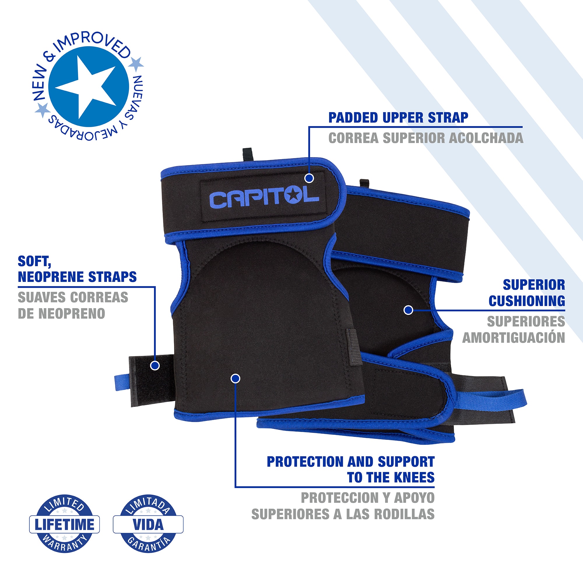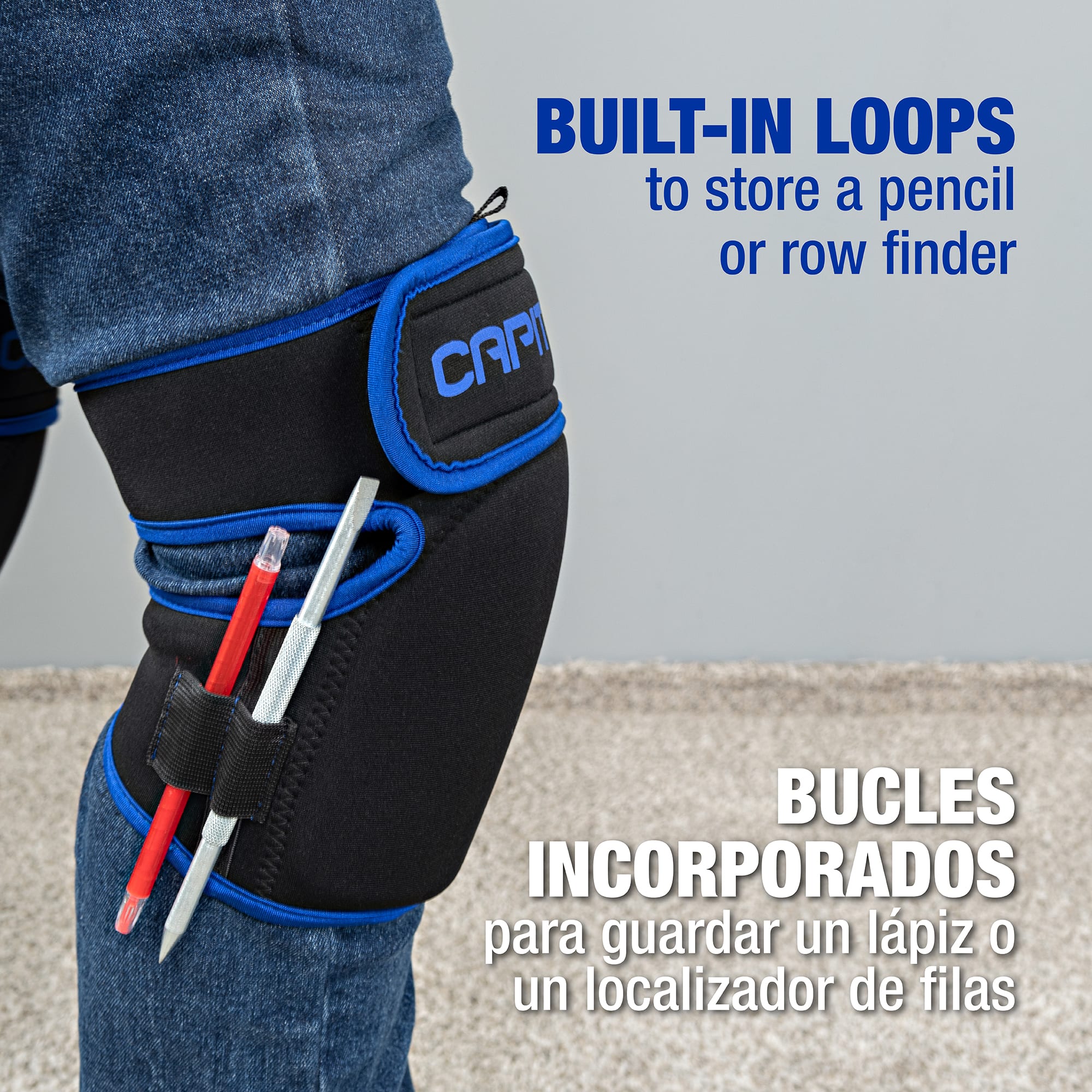 Conçues pour les installateurs, les genouillères pour revêtement de sol professionnelles Capitol procurent une protection et un matelassage supérieurs, et supportent les genoux. Pour les tenir en place, elles sont munies de sangles larges et souples en néoprène de qualité supérieure qui ne pincent pas, et la sangle supérieure rembourrée est spécialement conçue pour l’utilisation d’un coup de genou.