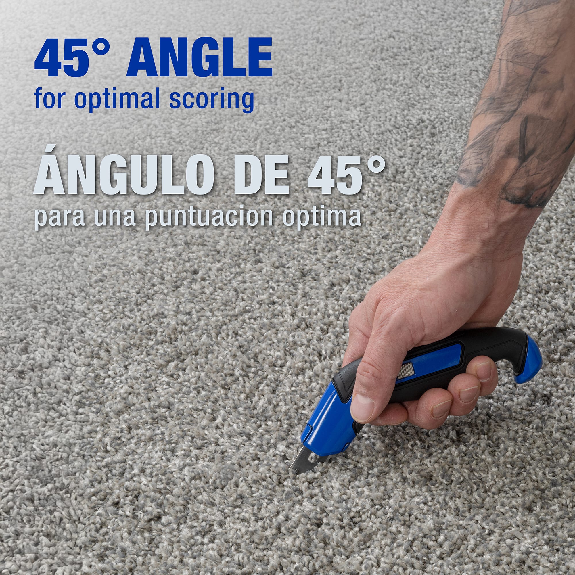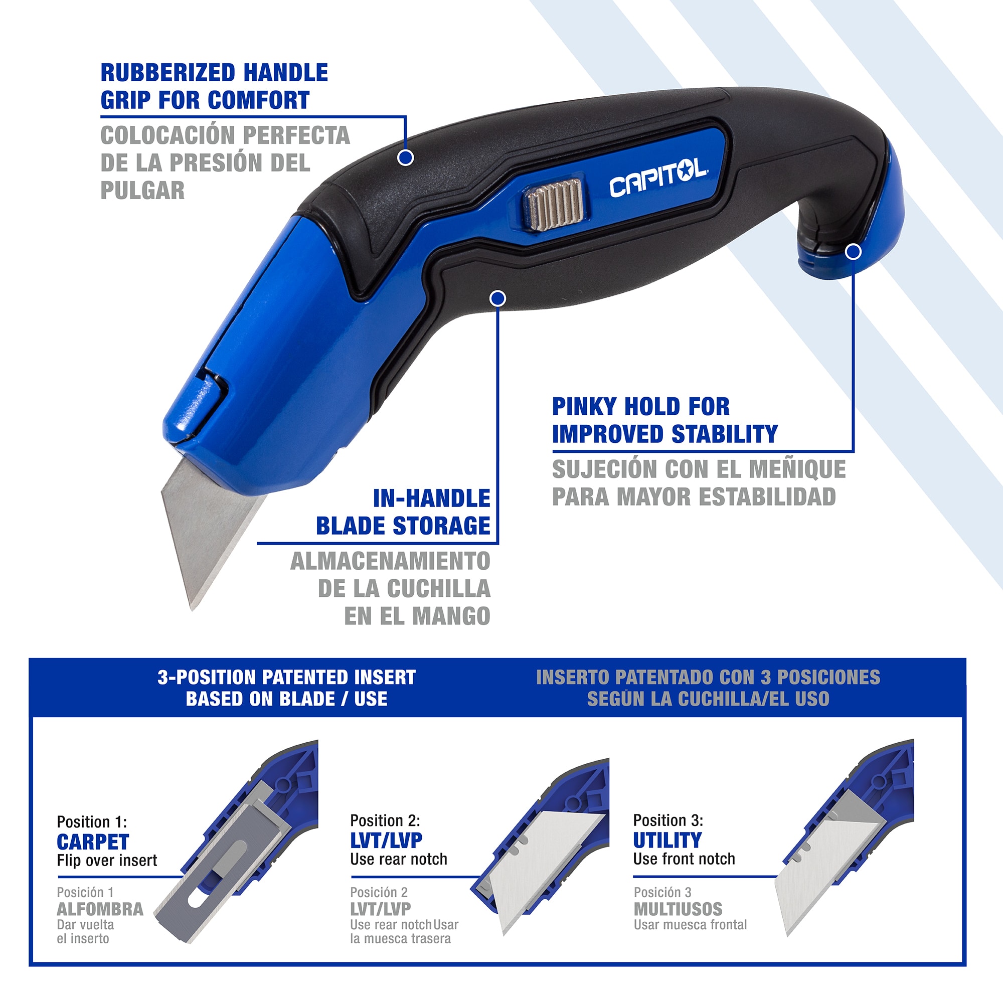 The 3-In-1 Carpet, LVT & Utility Knife is preferred for its versatility. With a quick blade change, it can be used to install carpet, LVT/LVP – or as a utility knife to cut twine and cardboard. It features a patented insert with 3 positioning options according to the blade type and cutting use. Position 1 sets the metal insert for use with a carpet blade. Flipping the metal insert allows it to be used with a utility blade. Position 2 is used for LVT/LVP applications and Position 3 is for use as a utility knife. The molded comfort grip and pinky hold increase leverage and pulling power. It includes in-handle blade storage for added convenience.